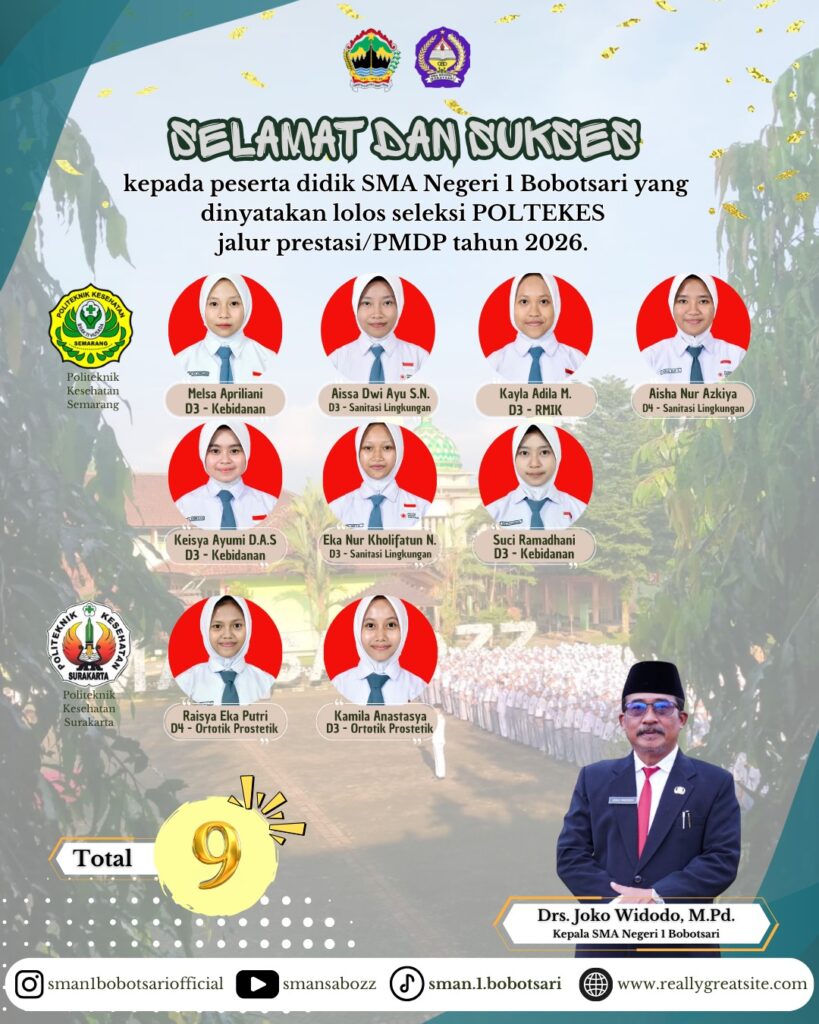 Apresiasi juga datang dari Kepala SMA Negeri 1 Bobotsari, Drs. Joko Widodo, M.Pd. Beliau memandang capaian 9 siswa di Poltekkes ini sebagai pelengkap torehan prestasi SNBP yang telah diraih sebelumnya. Beliau berharap kesuksesan ini menjadi pelecut semangat bagi siswa lainnya bahwa jalan menuju masa depan sangatlah terbuka lebar melalui berbagai jalur prestasi. “Ini adalah wujud nyata dari dedikasi kolektif antara guru dan siswa. Semoga prestasi ini menjadi fondasi kokoh bagi mereka untuk menjadi tenaga kesehatan yang berintegritas dan membanggakan almamater di masa depan,” pungkas beliau. (Humas Smansaboss).