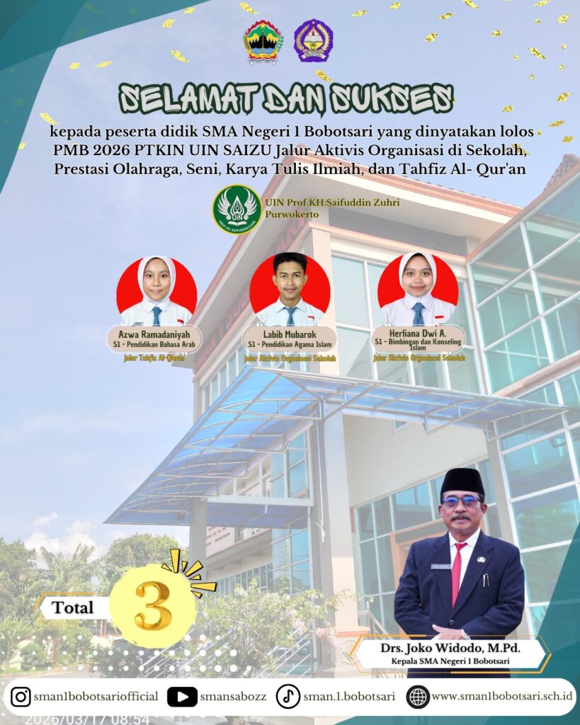 Kepala SMA Negeri 1 Bobotsari, Drs. Joko Widodo, M.Pd., menutup dengan apresiasi tinggi atas capaian ini. Beliau menegaskan bahwa keberhasilan menembus PTKIN merupakan bukti bahwa lulusan SMAN 1 Bobotsari memiliki kompetensi yang luas. “Semoga keberhasilan 13 siswa ini menjadi pembuka jalan bagi peningkatan minat siswa di tahun-tahun mendatang untuk memilih PTKIN sebagai tujuan studi yang menjanjikan. Ini adalah langkah awal untuk menjadi generasi yang tidak hanya cerdas secara ilmu pengetahuan, tetapi juga kuat dalam landasan spiritual,” pungkas beliau.
