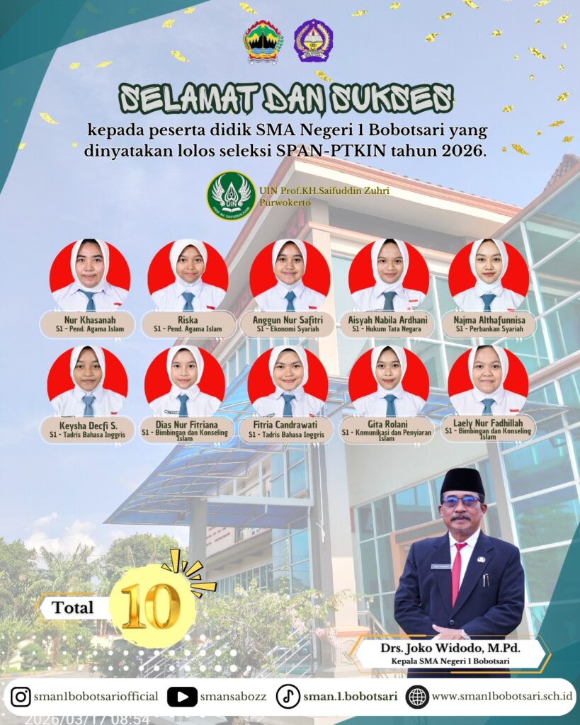 BOBOTSARI – SMA Negeri 1 Bobotsari kembali mencatatkan keberhasilan siswanya dalam menembus perguruan tinggi negeri, kali ini melalui jalur keagamaan Islam. Sebanyak 10 siswa dinyatakan lolos seleksi Seleksi Prestasi Akademik Nasional Perguruan Tinggi Keagamaan Islam Negeri (SPAN-PTKIN) di UIN Saifuddin Zuhri (Saizu) Purwokerto. Prestasi ini kian lengkap dengan keberhasilan 3 siswa lainnya yang lolos melalui jalur seleksi Mandiri Prestasi (AOSMA, Olahraga, Seni, KTI, dan Tahfiz), menjadikannya total 13 siswa yang siap melanjutkan studi di universitas berbasis Islam negeri tahun ini.